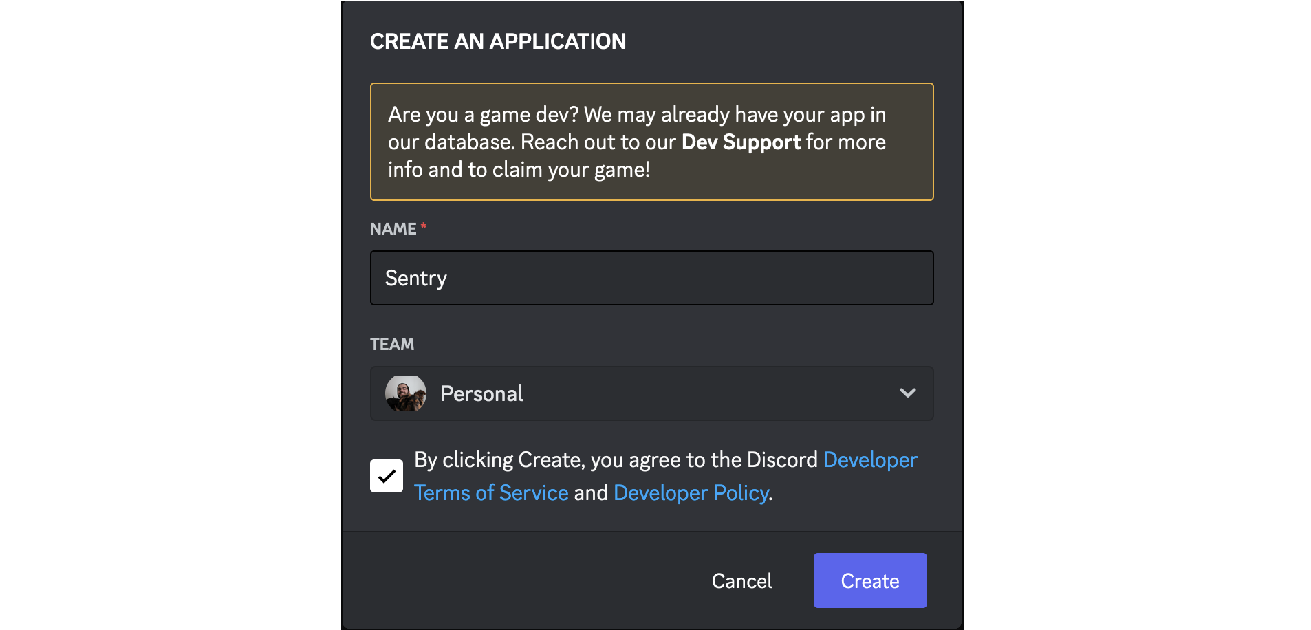 To use Sentry's Discord integration in your Sentry instance, you must first create a Discord bot. Go to the Discord Developer Portal and click New Application.