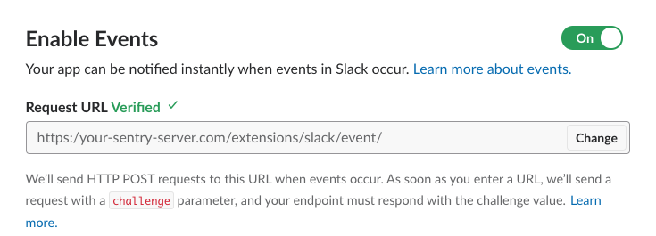 Navigate to Event Subscriptions and toggle “On”. Here you will enter another Request URL: {YOUR_DOMAIN}/extensions/slack/event/