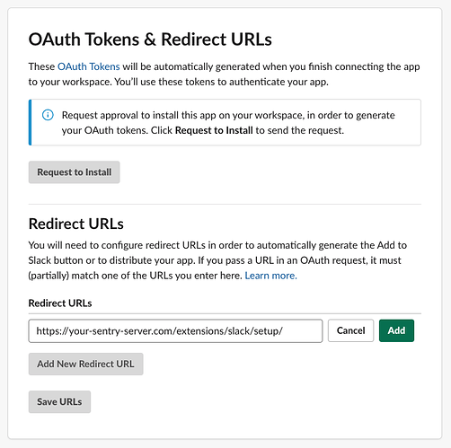NOTE: If you're doing local Sentry development, you should use a tool like Ngrok and add system.url-prefix: "https://<your_subdomain>.ngrok.io" to your ~/.sentry/config.yml, otherwise, installing the Slack APP will complain because the redirect URI points to localhost:8000. Also, install the Slack integration from the ngrok subdomain or it will fail to install.